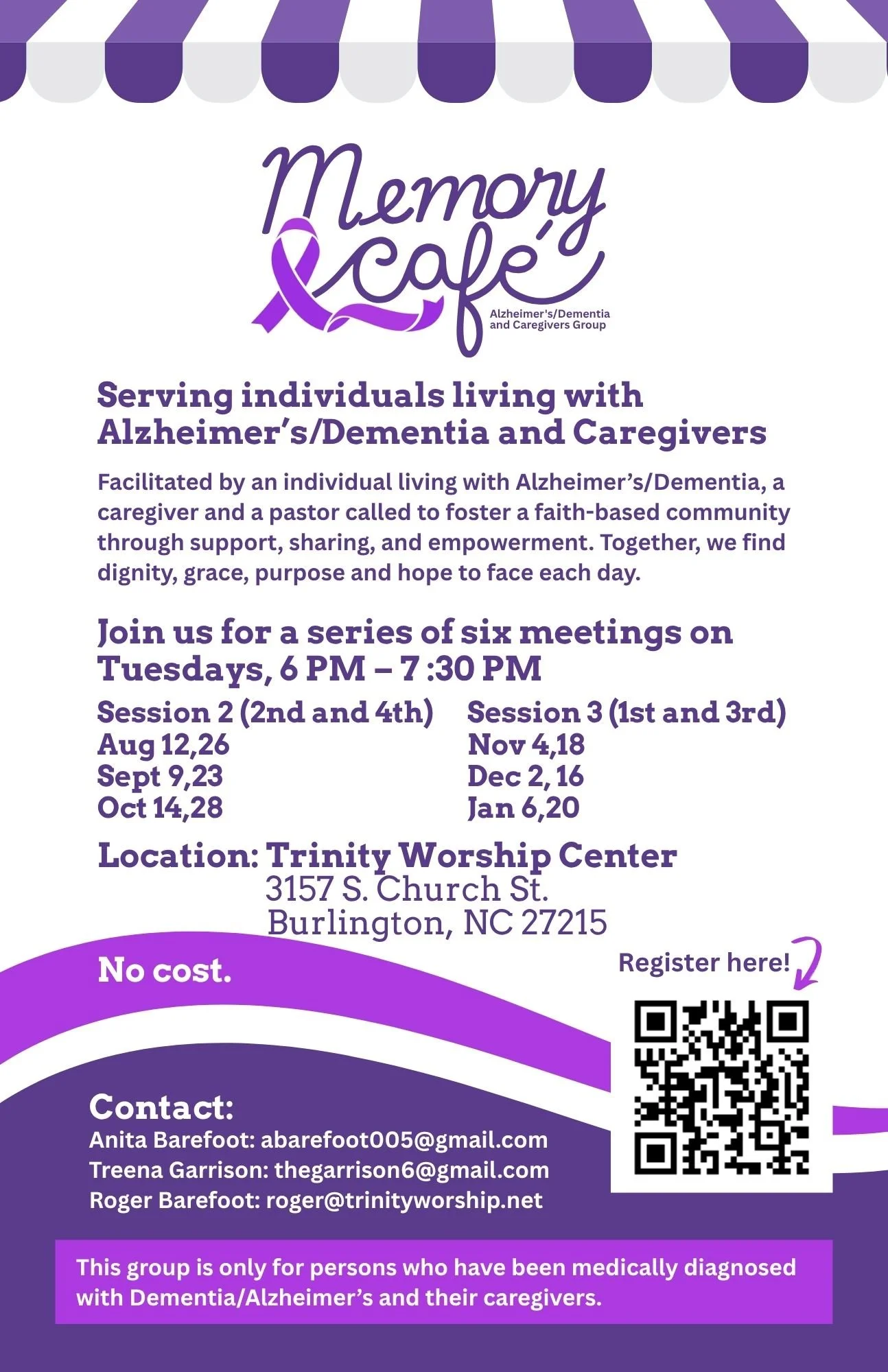 Facilitated by an individual living with Alzheimer’s/Dementia, a caregiver and a pastor called to foster a faith-based community through support, sharing, and empowerment. Together, we find dignity, grace, purpose and hope to face each day.
